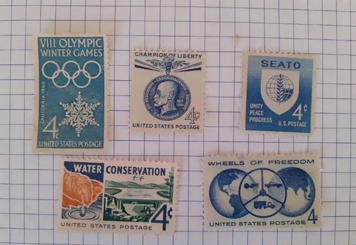 VENDO 5 SELLOS DE ESTADOS UNIDOS TODOS SON NUEVOS, DE 4 CENT. DE VALOR Y DE 1960,DE TEMAS DIFERENTES, SIN USAR ⬇️⬇️⬇️