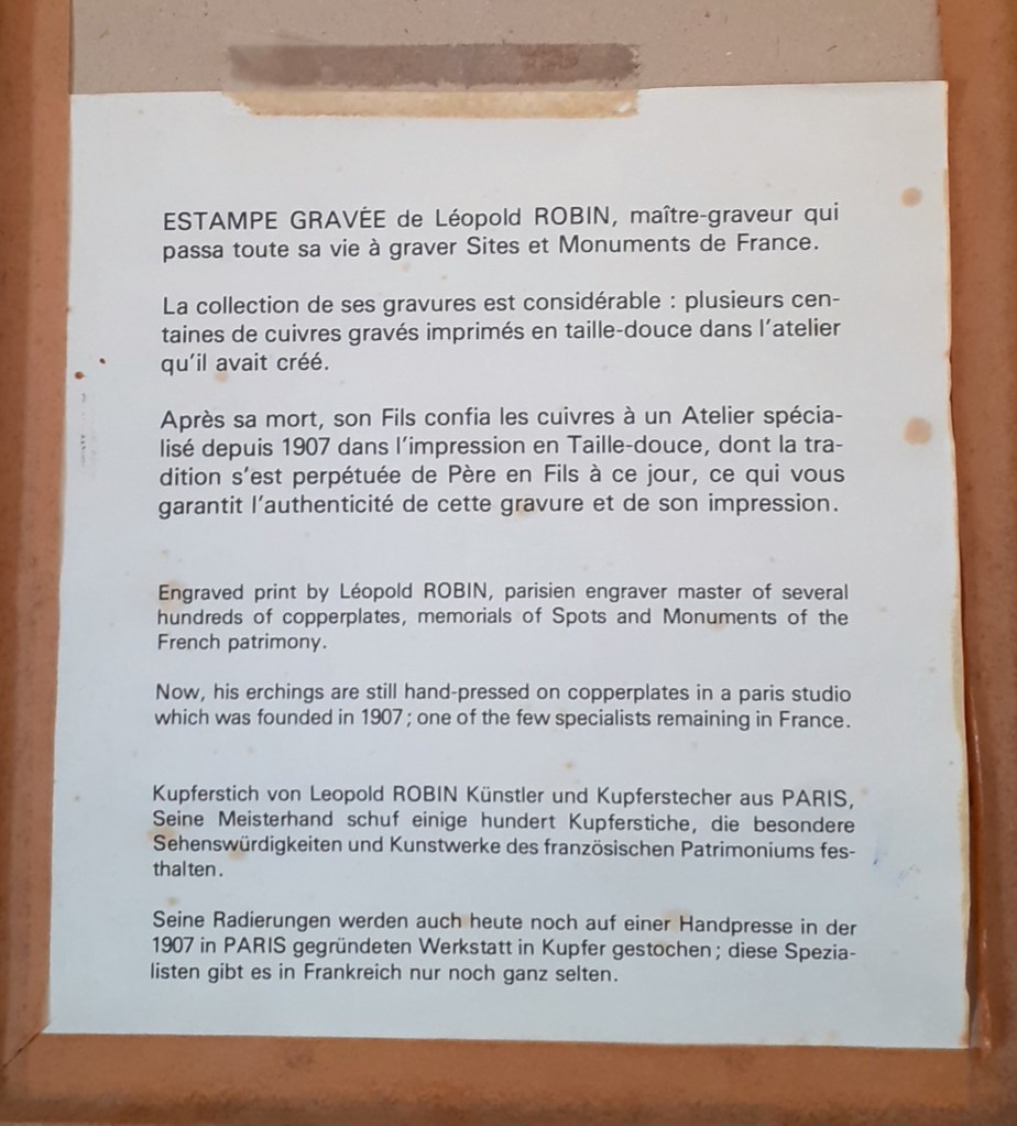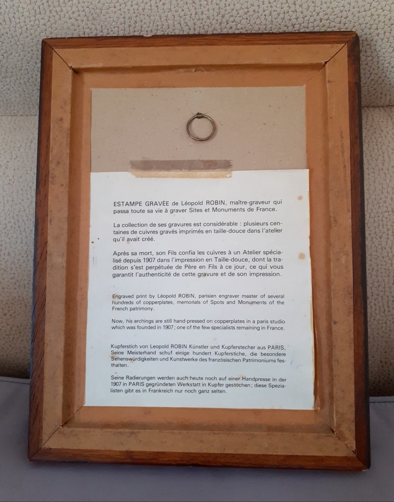 VENDO GRABADO ORIGINAL Y ANTIGUO (1930 APR.) DE LEOPOLD ROBIN,, ROUE DE RUE DAMIETTE, PRENSADO A MANO SOBRE PLACA DE COBRE EN UN ESTUDIO DE PLACAS DE COBRE FUNDADA EN PARÍS EN 1907, UNOS DE LOS POCOS ESPECIALISTAS QUE QUEDAN EN FRANCIA, ENMARCADO EN MARCO DE MADERA, EN TOTAL MIDE 22X28 CM MIENTRAS LA PARTE VISIBLE MIDE 10XA4 VM APROXIMADAMENTE, PESA 490 GR ESTA EN BUEN ESTADO,GASTOS DE ENVIO Y EMBALAJE ES A CARGO DEL COMPRADOR SEGUN TARIFAS ACTIUALES DE CORREO O AGENCIA DE TRANSPORTE QUE SE EQUIERE UTILIZAR,NO ME AGO CARGO DE EVENTUALES DAÑOS O PERDIDAS QUE PUEDE CAUSAR EL SERVICIO DE TRANSPORTE O DE CORREOS